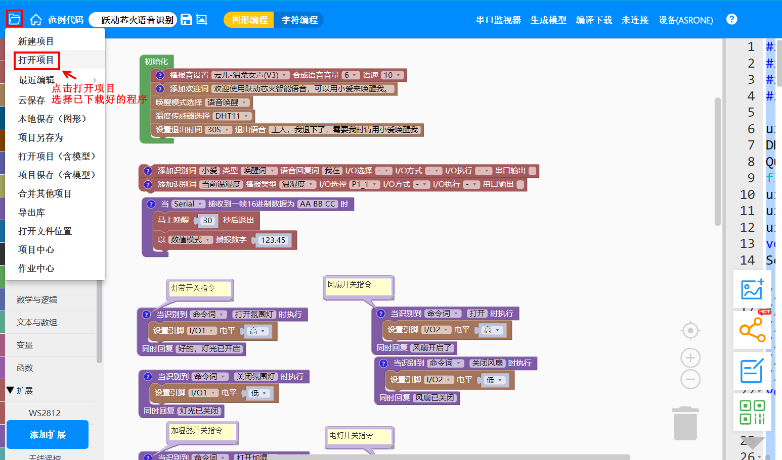 打开天问编程软件,左上角点菜单,在打开项目,在选择你刚下载的语音程序