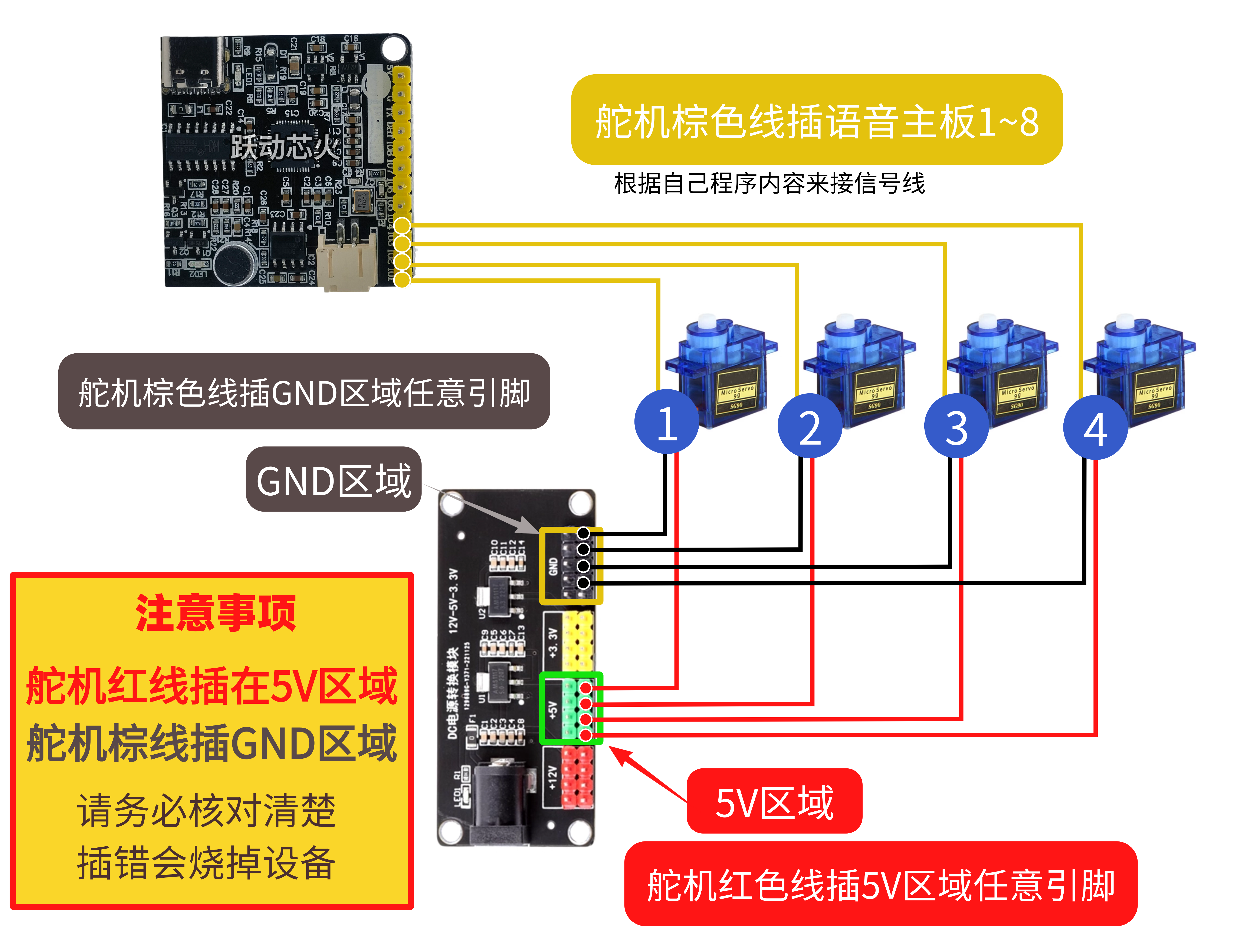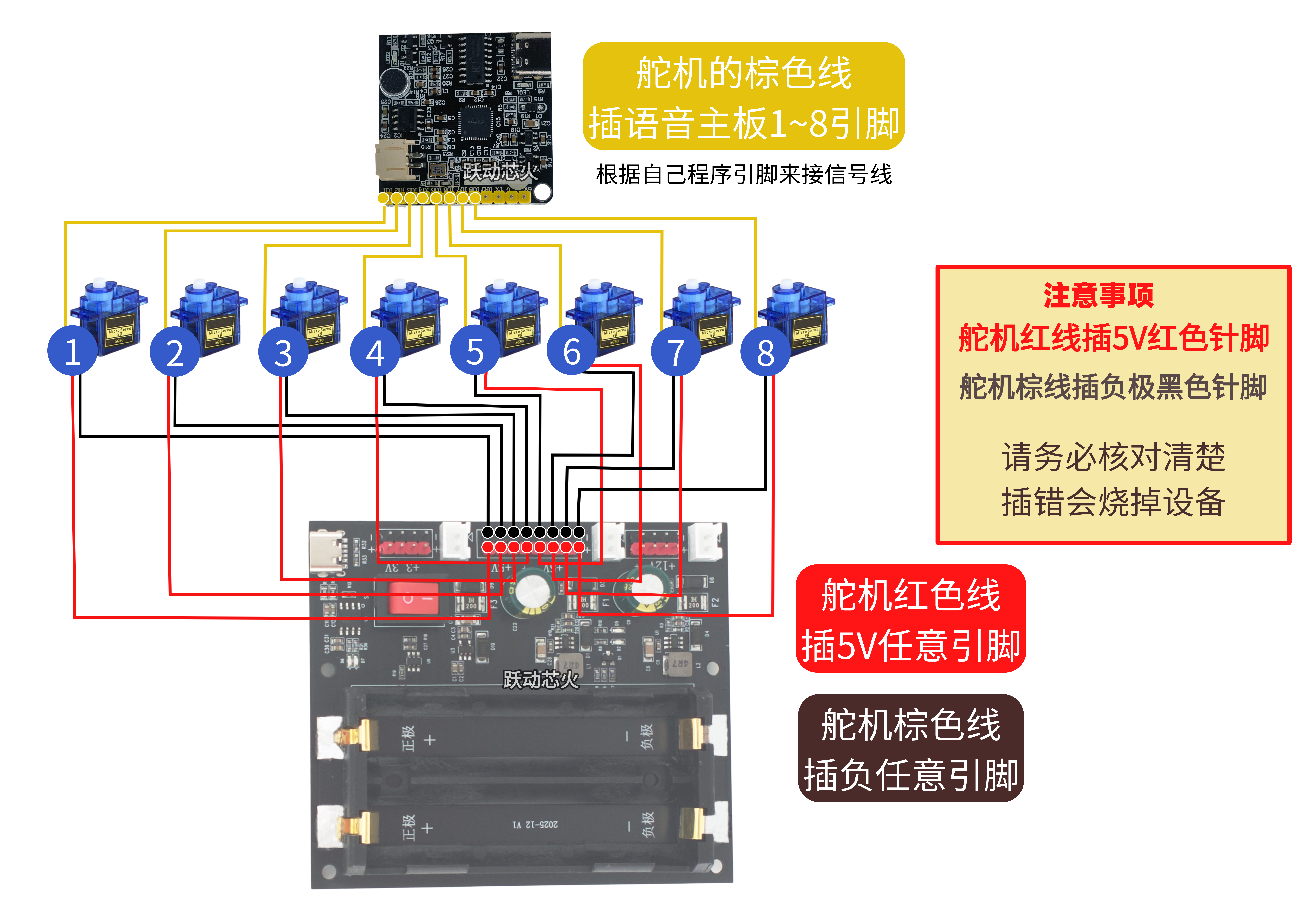 2.硬件上接8个舵机时需要用到8个正负电源引脚与8个信号控制引脚。 正负由电源扩展板提供,信号由语音主板控制。完美匹配!