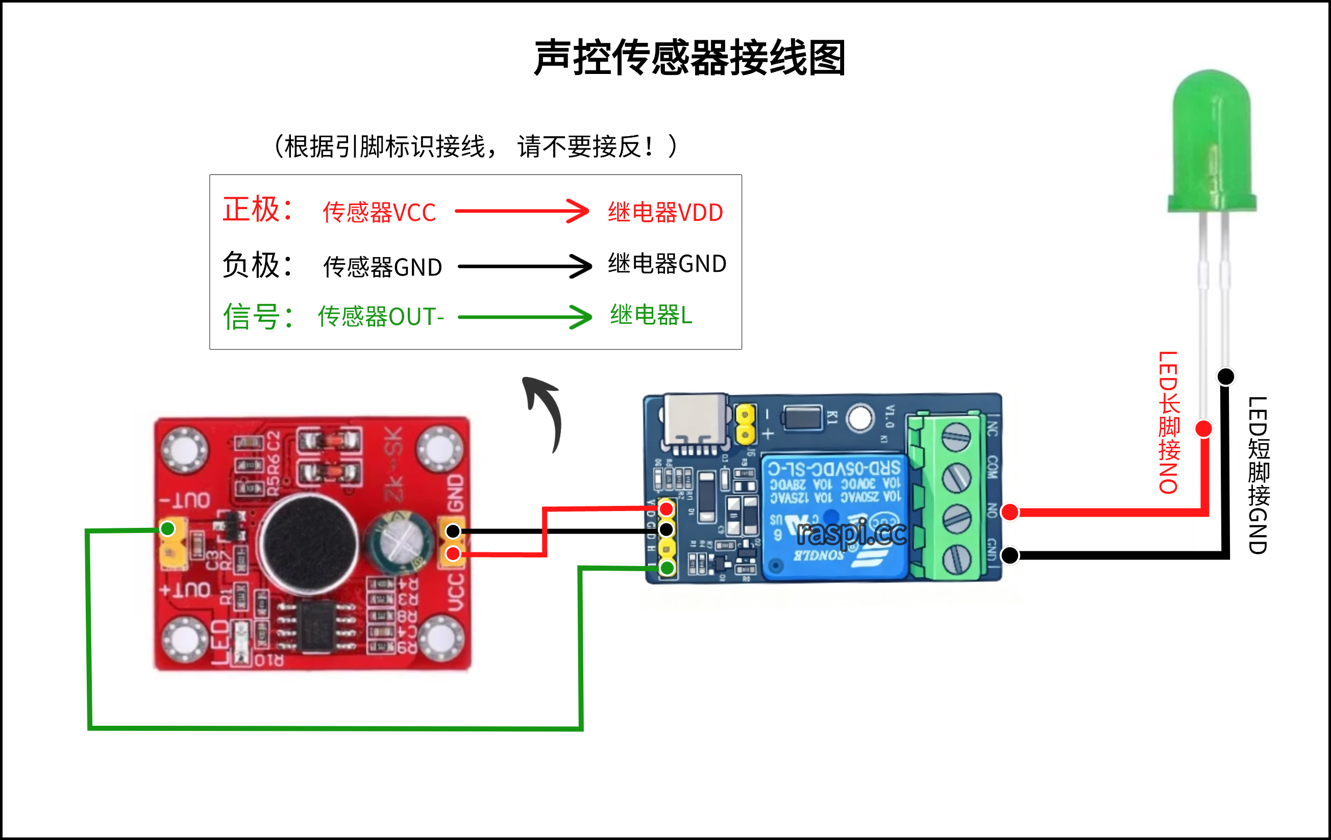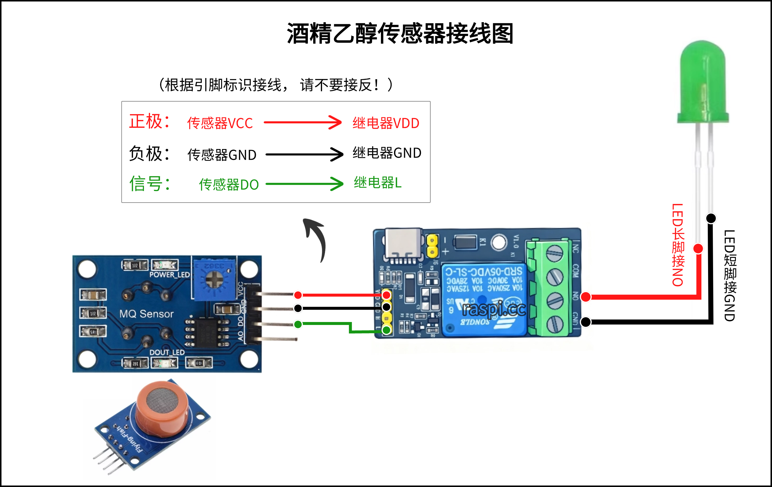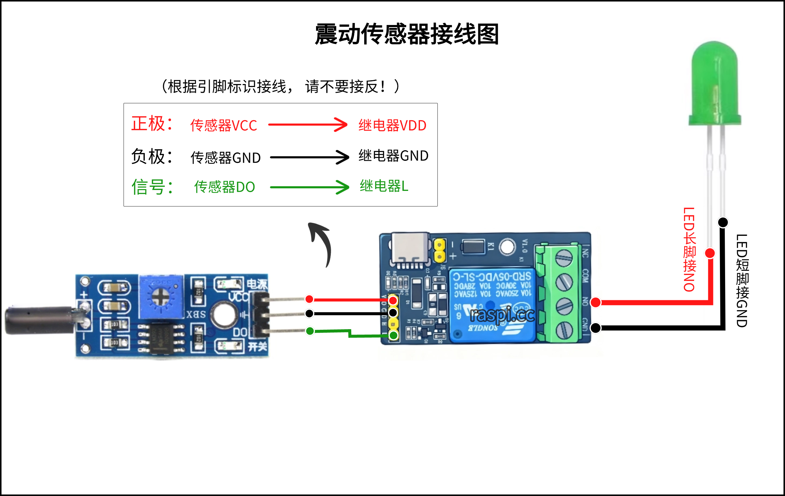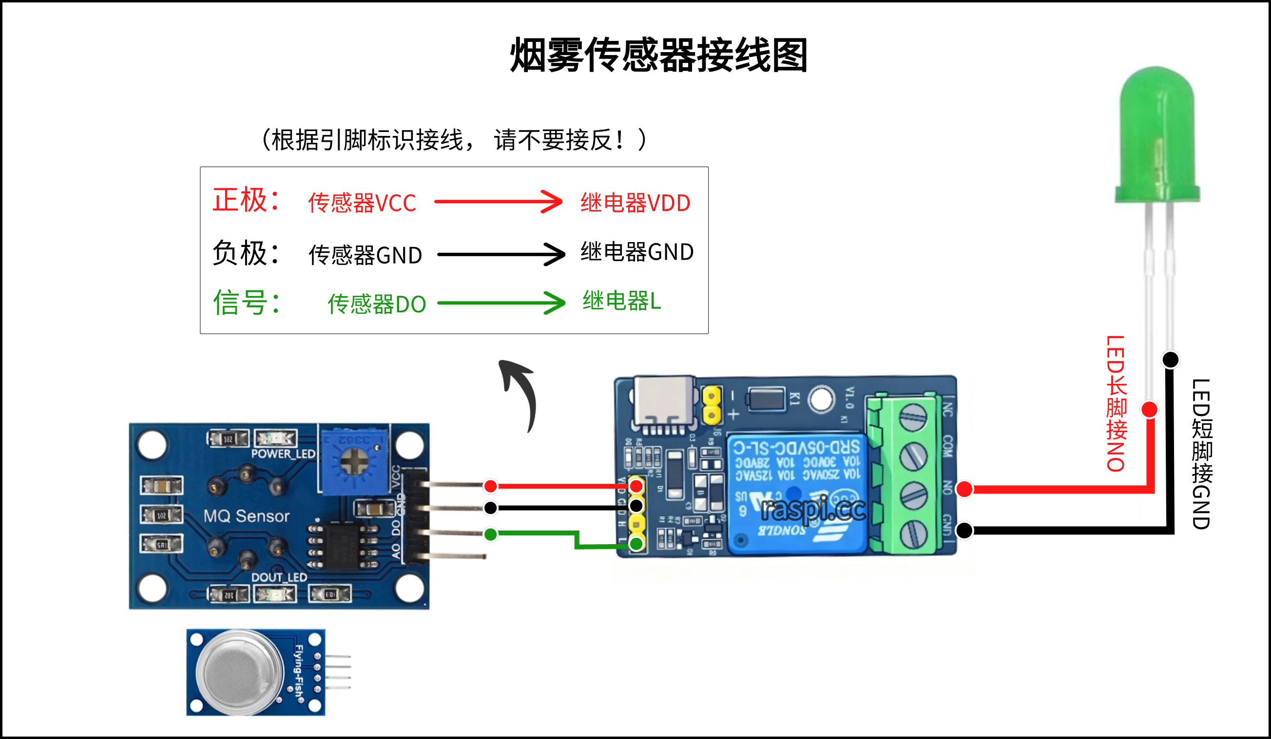 1.可将LED灯与报警器的线并联在一起同时插入控制端NO和GND即可。