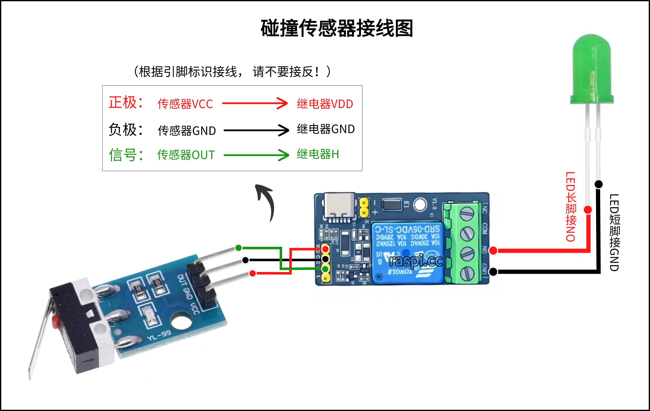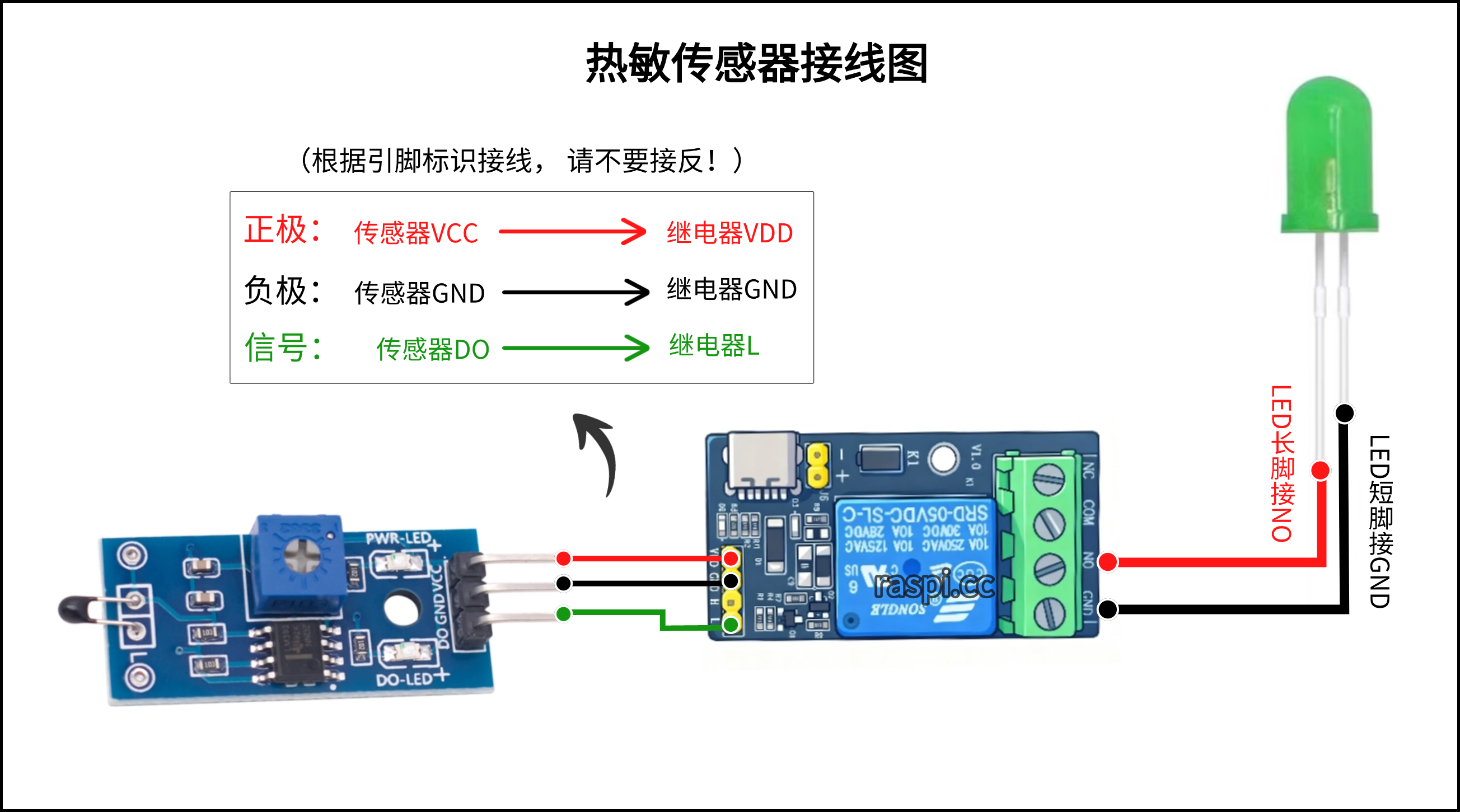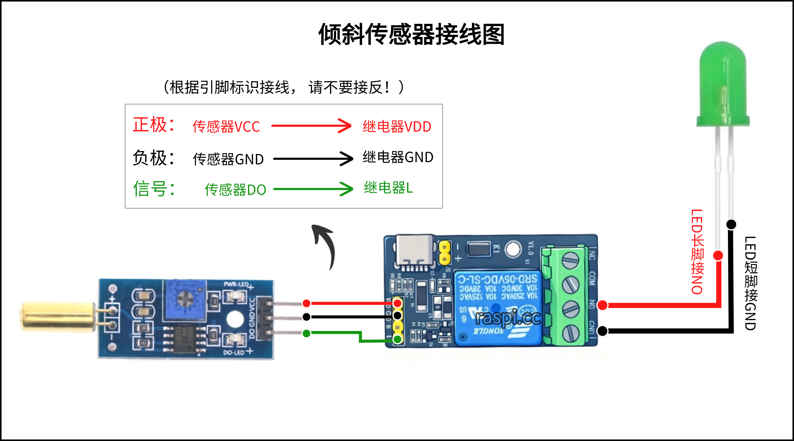 1.可将LED灯与报警器的线并联在一起同时插入控制端NO和GND即可。