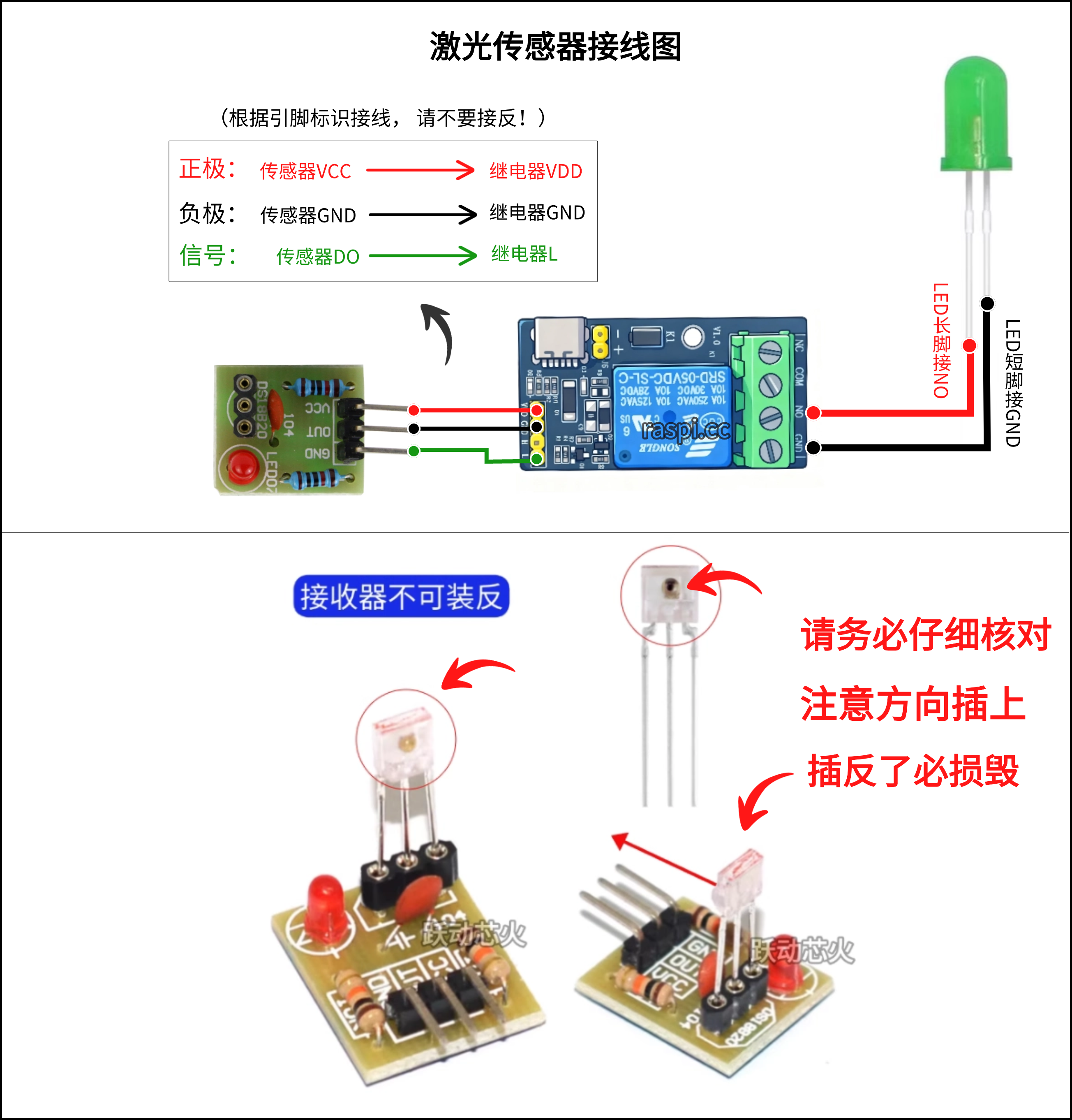 1.请调试好传感器电位器。可参考步骤三关于调试传感器及调试视频演示,亮灯或者报警说明传感器已检测到了。如果状态不对请调节电位器。电位器旋钮需要轻轻慢慢的旋转,不可大力出奇迹!