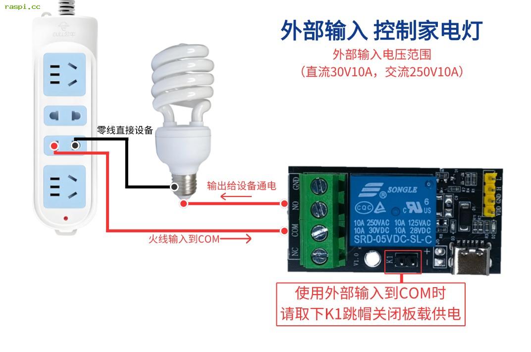 如果控制外部的其他电压设备,首先需要先取下K1的跳帽关闭板载5V供电。 按下图接法将其他设备接入即可实现控制(下图接家用灯举例)